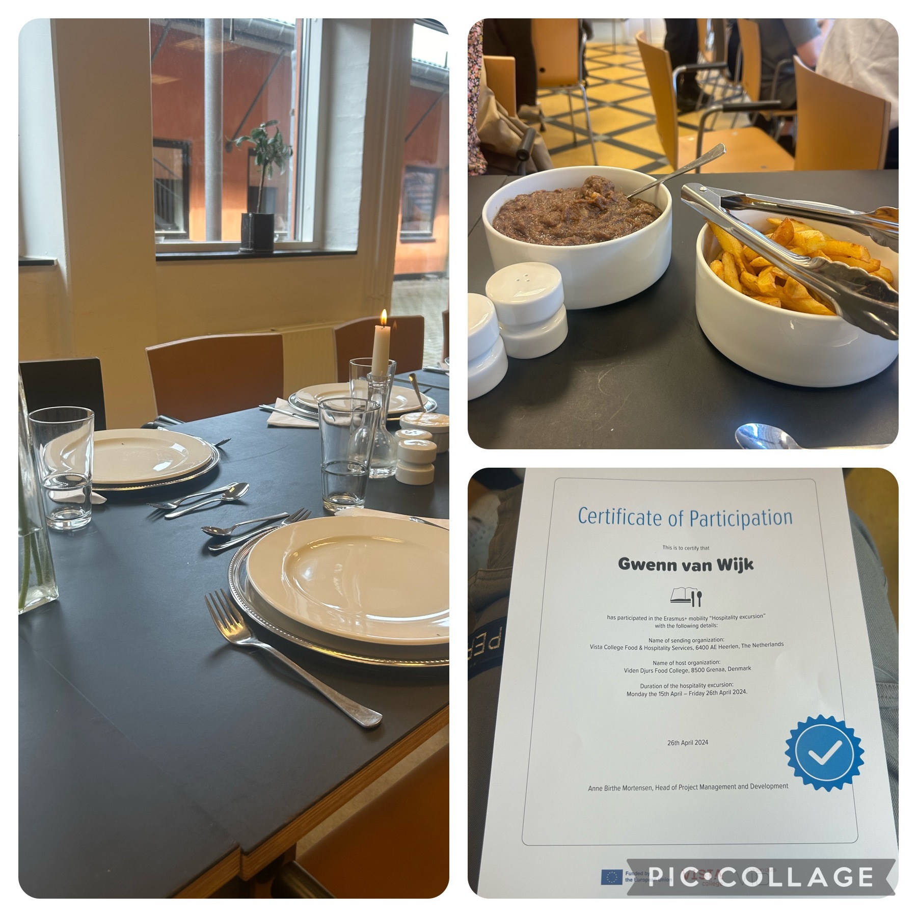 Wij hebben alweer verzameld op de campus om 8:45. Hierna zijn wij naar school gelopen voor onze laatste dag school. Wij hebben het Nederlandse gerecht “Zuurvlees, koudeschotel en slagroomsoesjes” gemaakt. De deense studenten die er waren hebben goed mee geholpen. Het zuurvlees was al vrij gauw klaar. Dat hebben een paar studenten Dinsdag al gemaakt in verband met het intrekken en bereiden van het vlees. Hierna hebben wij lekker gegeten en hebben de docenten afgesloten met een speech. Vanuit daar kregen wij een certificaat mee en gingen wij richting huis. We zijn om 14:00 op de campus vertrokken en zijn rond 02:00 in Nederland terug aangekomen. Een enorme reis dus! Ik heb het enorm naar mijn zin gehad deze 2 weken en heb ook enorm veel geleerd!