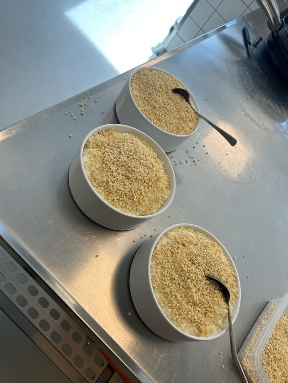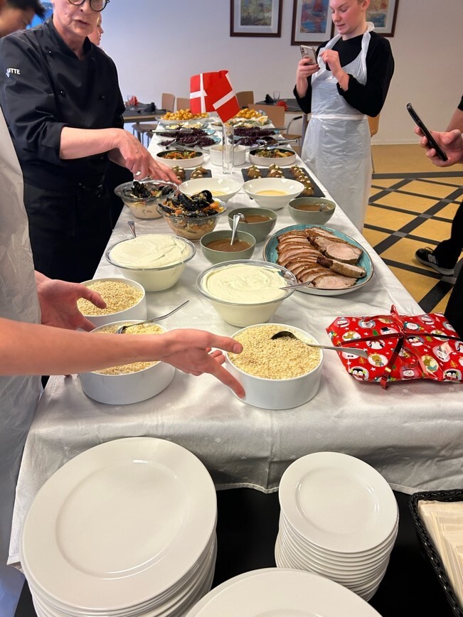 Vandaag zijn we viden djurs school geweest om met de Deense klas die meeging gerechten te maken. We hebben Carmel aardappel, rode kool, roasted pork belly met jus, hasselback aardappels, Rockefeller aardappels, rijstenpuddig met slagroom en kersensausen en mossel ravioli’s. We werden in teams gezet en ik zat in the chrismas diner team en moest ik met een andere Deense student het dessert maken (rijspudding met slagroom en kerssensaus). Het was best wel makkelijk om te maken maar de rijst was niet optijd koud genoeg waardoor iedereen zelf ze slagroom erbij moest mengen. Toen alles af was hebben we het met elkaar op gegeten. In het dessert zat ik een amandel die iemand moest vinden en die winde dan een prijs dat is dus een kerst traditie in Denemarken
