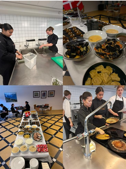 - april zijn we met de Deense studenten gaan koken in hun praktijk lokaal. We hadden 7 teams dacht ik? Ik zat bij de creatieve kruiden met een paar klasgenoten van me en 2 Deense student. Het was een moeilijk onderwerp want we wisten niet eerst hoe en waar we ze voor kunnen gebruiken uiteindelijk hebben we aardappels in de oven gedaan met knoflookboter en rozemarijn en paprikapoeder en als een sausje cremé fraiche met honing, citroen en beetje paprikapoeder. Daarnaast hebben Deense student wortel, ui en nog andere groente gebruikt om een salade te maken met mayonaise. De andere studenten hebben bijv: Tortelini gemaakt, mosselen, oesters met kaas, Rijsdessert van de Denen enzovoort. Het was allemaal wel goed gegaan vind ik. Het was een lange dag!! We ging met z’n alle om 12 uur lunchen wat we hadden gemaakt en we gingen om 13:15 afwassen schrobben schoonmaken en het was heel veel maar we waren wel op tijd klaar dus toen zijn we terug gegaan naar de campus.