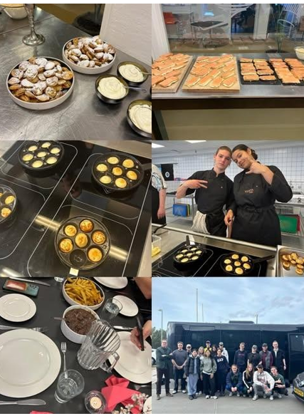 - april was onze laatste dag in Denemarken. We hadden een laatste praktijkles met de Denen. Het opdracht was dat we ons eigen Limburgse gerechten gingen maken. Het bestond uit Zuurvlees, Poffertjes ,Tompouce. We hadden 3 groepen gemaakt met wat Deense studenten ik stond bij de partie van poffertjes het was niet echt veel te doen want we waren best snel klaar. Ik kwam erachter ze hebben ook niet een bepaalde pauze want ze zeiden we nemen gewoon pauze wanneer ze willen. Ze hebben ook hun eigen regels zoals als je met meer dan 12 studenten in de keuken staat mag je geen verse eieren gebruiken. Ik heb hieronder een paar foto´s maar niet veel.
